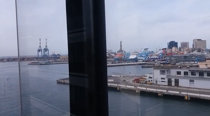 Sensivelmente a meio do MSC Bellissima, há dois elevadores panorâmicos (um de cada lado do navio) que funcionam entre os decks 5 e 15. Aqui, no porto de Génova.
