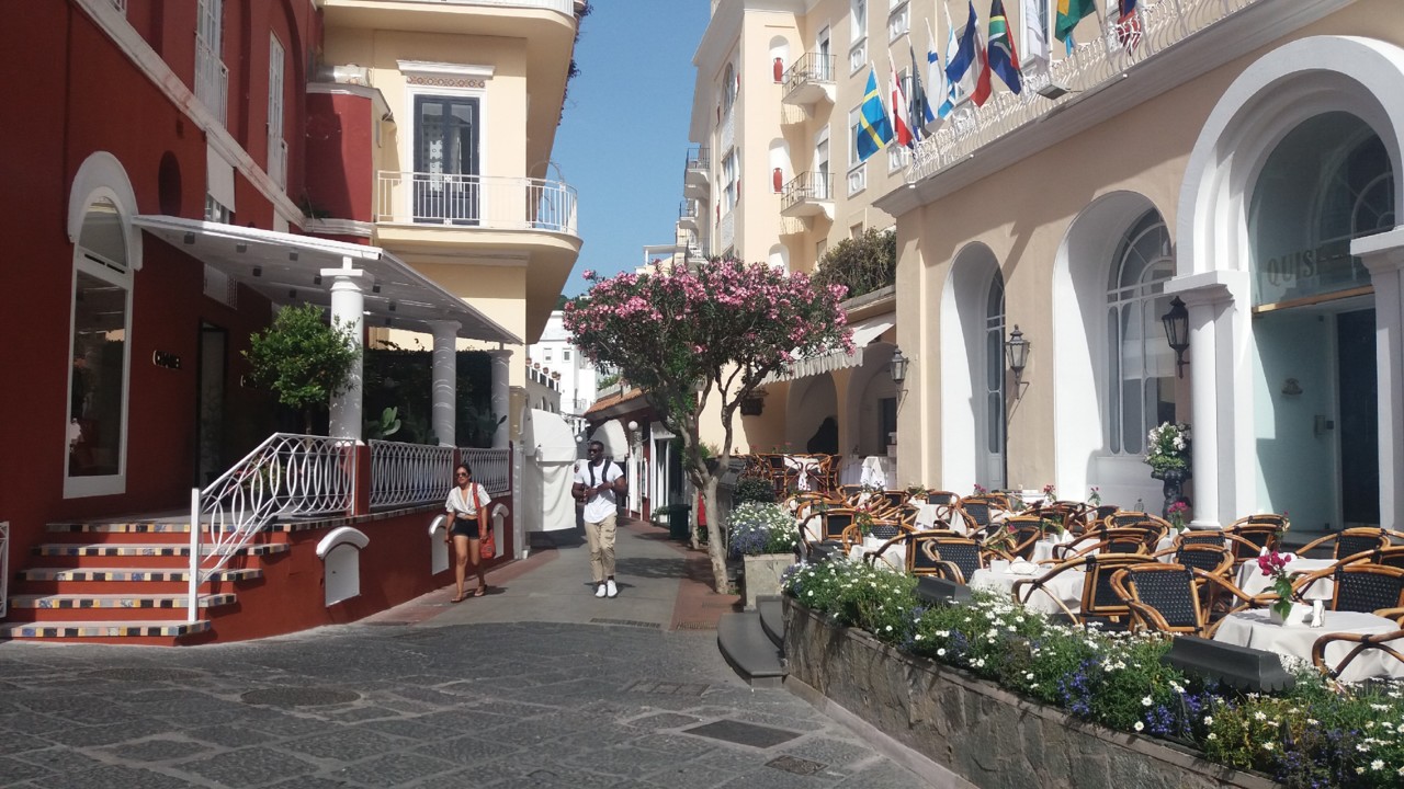 Capri também é célebre por ser difícil arranjar um lugar numa esplanada. Mas não é bem assim... Bastam umas centenas de metros de afastamento do centro, para encontrar ruas com menos movimento e com muitas esplanadas. Quanto aos hóteis, têm óptimo aspecto. Os preços é que devem ser terríveis, mesmo mais afastados do centro!